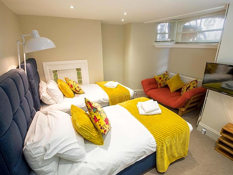 This twin room has a double bed with duck and down feather duvets and pillows. Additional benefits include a flat-screen TV, DAB radio, hairdryer and free Wi-Fi. There is access to a shower room located next door and shared with one other room. Laundry and cooking facilities are available to use in the new and fully equipped shared kitchen. This room is in our basement. There are three rooms sharing two bathrooms. Please note that sofa beds are smaller than a single bed and are best suited to a child or small adult. Please note that as of October 2020 the shared kitchen will be closed when more than 1 household books the 2 or 3 rooms that would normally shared the kitchen. This may change in time in line with guidance. With regards to the shared bathroom, if all rooms became booked the hotel would operate a booking system for the shower in order to clean it between use.